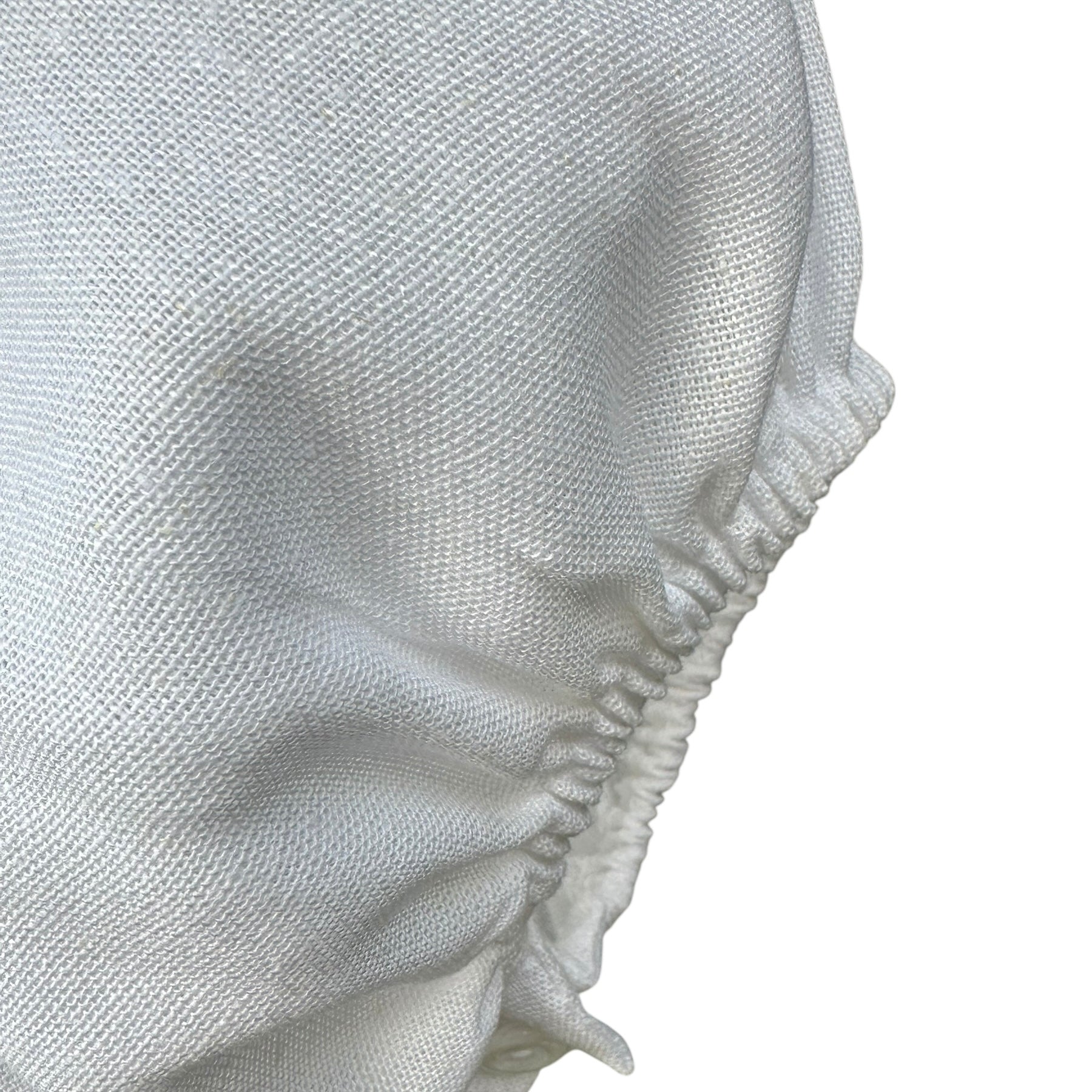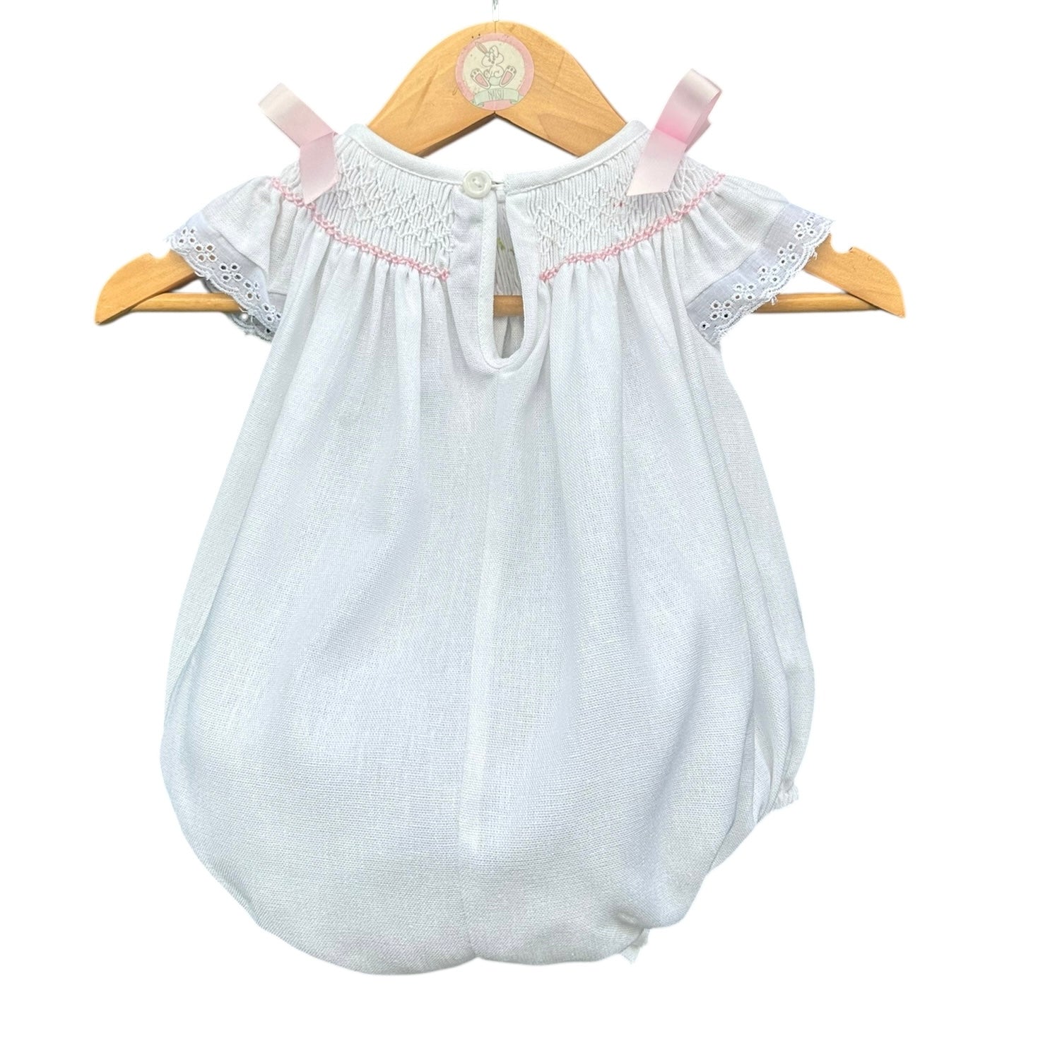 La ranita rosa para bebé está confeccionada en lino blanco, un material que ofrece transpirabilidad y comodidad para la piel delicada del infante. El bordado a mano en rosa, las tiras bordadas en las mangas y los moños en los hombros añaden un toque estético. Los botones en la entrepierna facilitan el cambio de ropa.